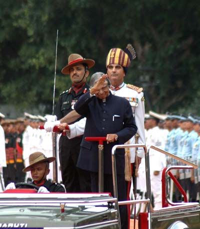 Kalam taking salute: Outgoing President APJ Abdul Kalam inspecting the guard of honour during the ceremonial reception in the forecourt of Rashtrapati Bhavan in New Delhi on Wednesday.