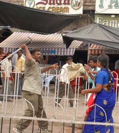 Raise of a baton: A police man caning a woman activist who participated in the dharna led by left parties in Hyderabad on Thursday.