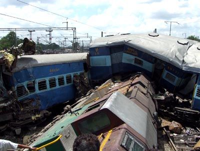 Mangled in collision: Mangled coaches and engine of Jodhpur-Howrah Express which derailed at Juhi in Kanpur on Tuesday.