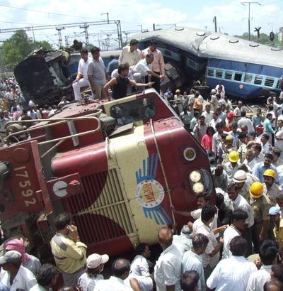 Collision and the aftermath: Mangled coaches and engine of Jodhpur-Howrah Express which derailed at Juhi in Kanpur on Tuesday.