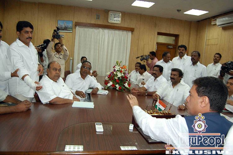 Legislators of opposition parties complaining to Speaker K. R. SureshReddy about the alleged attack on them by marshals. A legislatorvemana Reddy , who was injured in the scuffle also called on the speaker.They alleged that marshals manhandled them while evicting them afterthe speaker suspended them for the day for stalling proceedings of thehouse.Venama Reddy seen Hand fractured on 11th Feb