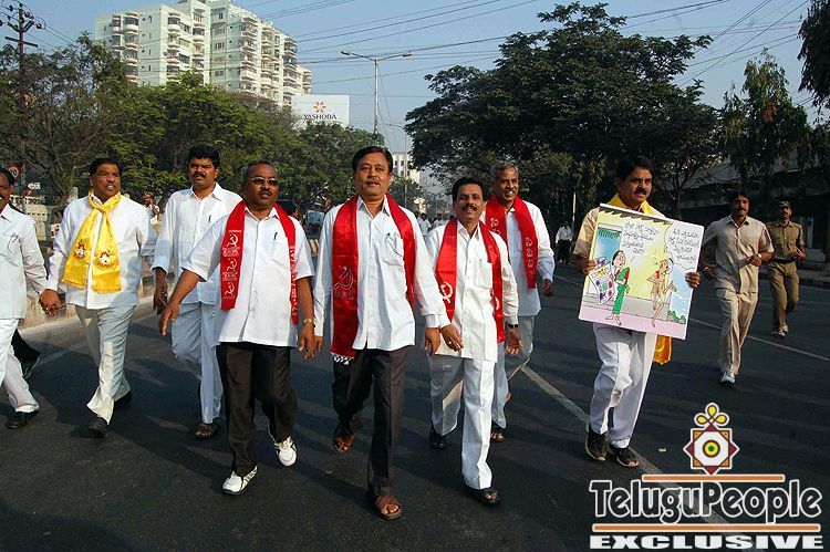 TDP supremo N Chanadera Babu Naidu along with TRS and CPI,CPM legislators walk from Ambedker statue at Tank Bund to Assembly Hall protesting assembly marshals assault on opposition MLAS , on Thursday, 12th Feb.