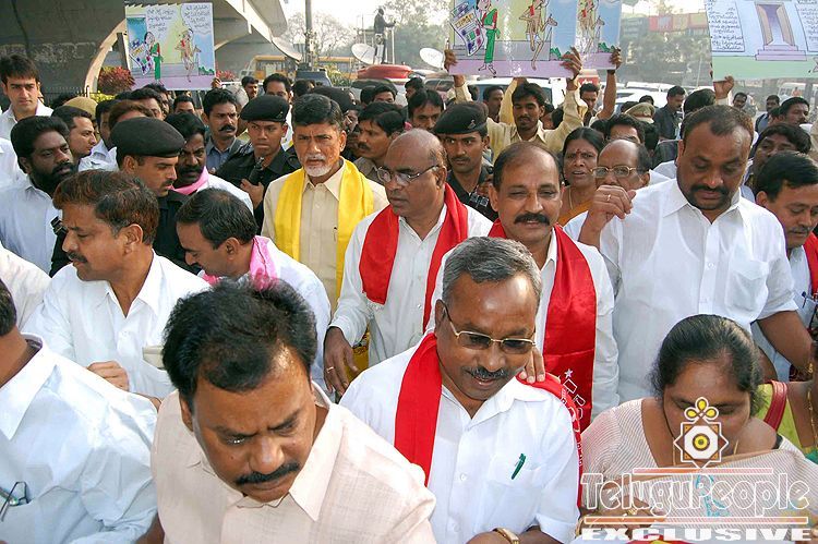 TDP supremo N Chanadera Babu Naidu along with TRS and CPI,CPM legislators walk from Ambedker statue at Tank Bund to Assembly Hall protesting assembly marshals assault on opposition MLAS , on Thursday, 12th Feb.
