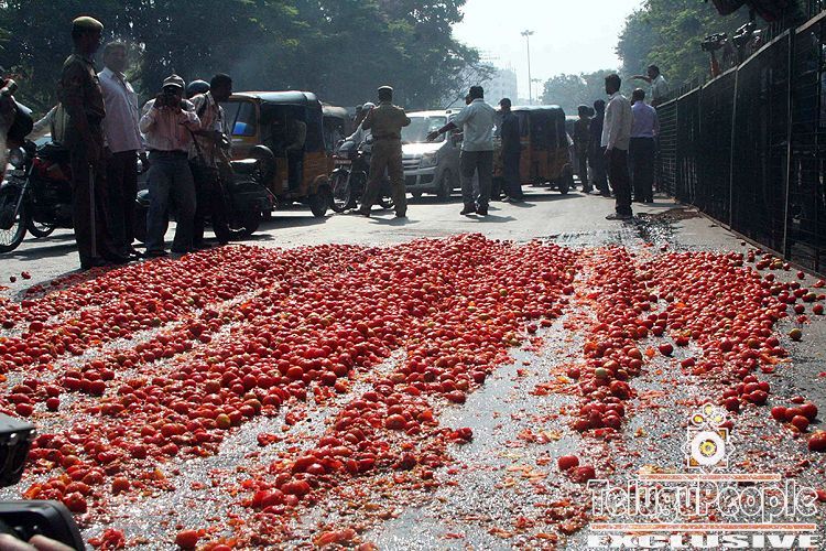 In an unprecedented protest, tomato farmers from Madanapalle brought a truckload of tomatoes and dumped the produce in front of the Assembly gate (on the road adjacent to the barricades) to highlight the distress sale of tomatoes at Rs 2 kg. Even as the police seized one lorry, another lorry managed to give a slip and unloaded tonnes of tomatoes on the road. The farmers were giving vent to their protest over the wasting of time by ruling Congress and main opposition Telugu Desam and other opposition parties on non-issues (like irregularities by YSR and Chandrababu Naidu's families).
