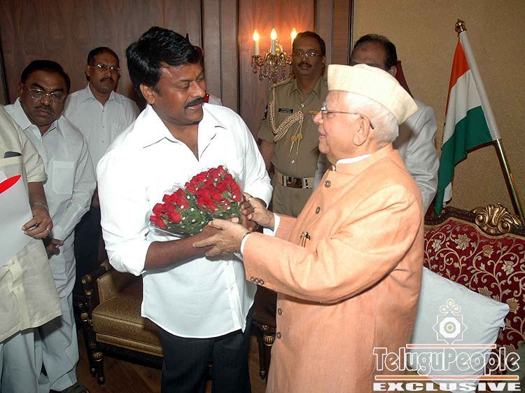 PRP President Chiranjeevi, along with party senior leaders, submits a memorandum to Governor Narayan Dutt Tiwari at Raj Bhavan on Sunday.