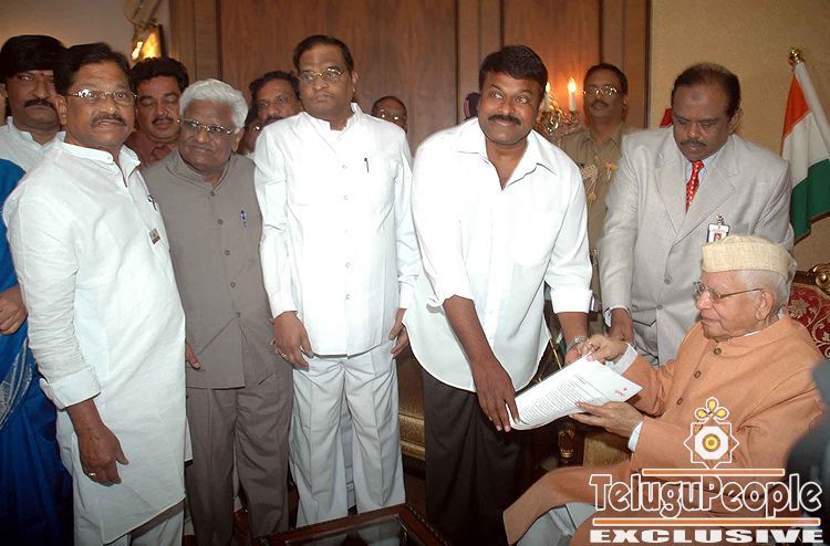 PRP President Chiranjeevi, along with party senior leaders, submits a memorandum to Governor Narayan Dutt Tiwari at Raj Bhavan on Sunday.