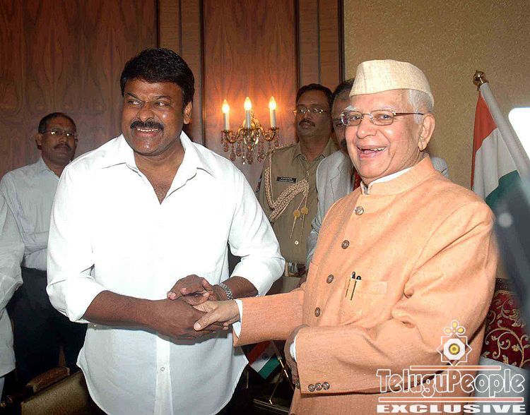 PRP President Chiranjeevi, along with party senior leaders, submits a memorandum to Governor Narayan Dutt Tiwari at Raj Bhavan on Sunday.