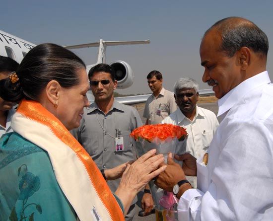 CM Y.S. Rajasekhara Reddy welcomes Sonia Gandhi on her two day visit to AP