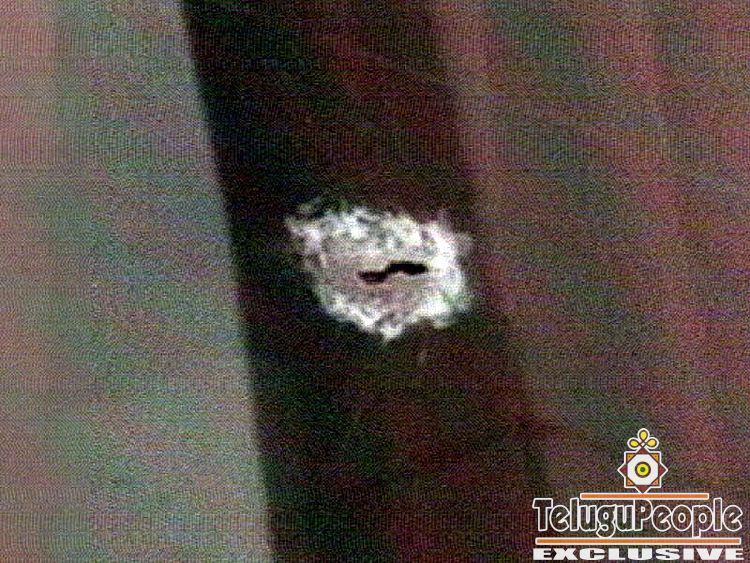 Gunshot hole in the window of the team bus.