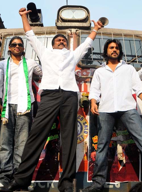 Chiranjeevi launches Praja Railu Yatra in Secunderbad station on Saturday. Ramcharan Teja and Allu Arjun joined this yatra