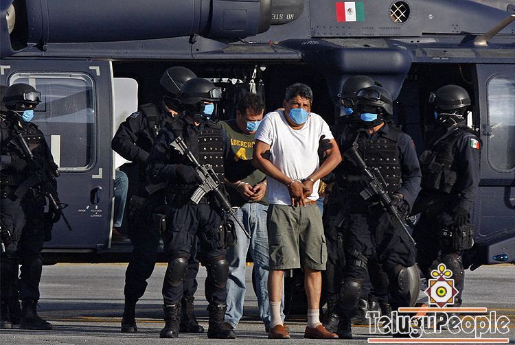 Suspected member of the Gulf Cartel Gregorio Sauceda Gamboa, center, is escorted to be presented to the press after his arrest at federal police headquarters in Mexico City, Wednesday, April 29, 2009. He and the police officers escorting him wear face masks as a precaution against swine flu. Gamboa is one of Mexico's 24 most-wanted drug traffickers, according to federal police.