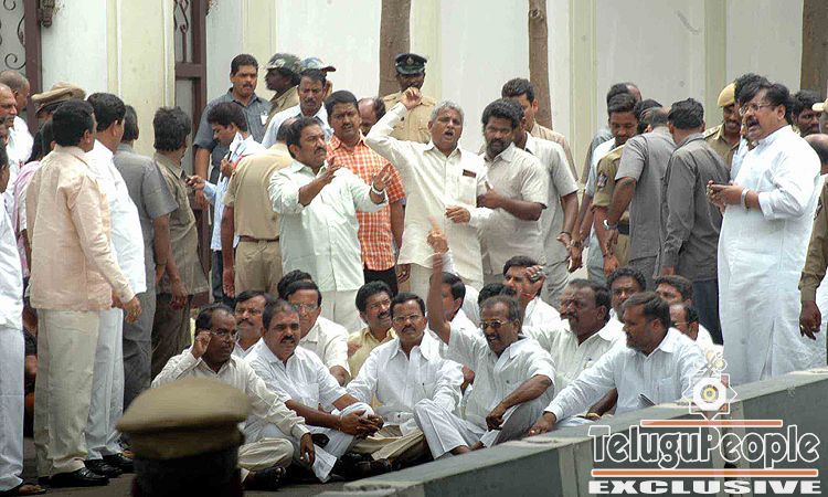 HYDERABAD: The police took into custody 61 MLAs, 10 MLCs and six MPs of the Telugu Desam Party when they staged a dharna in front of the camp office of Chief Minister Y.S. Rajasekhara Reddy on Sunday afternoon, demanding withdrawal of criminal proceedings against Kovvur MLA T.V. Rama Rao who was also among those arrested.