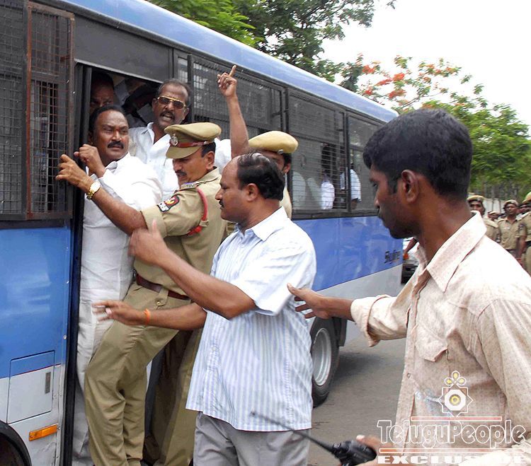 HYDERABAD: The police took into custody 61 MLAs, 10 MLCs and six MPs of the Telugu Desam Party when they staged a dharna in front of the camp office of Chief Minister Y.S. Rajasekhara Reddy on Sunday afternoon, demanding withdrawal of criminal proceedings against Kovvur MLA T.V. Rama Rao who was also among those arrested.