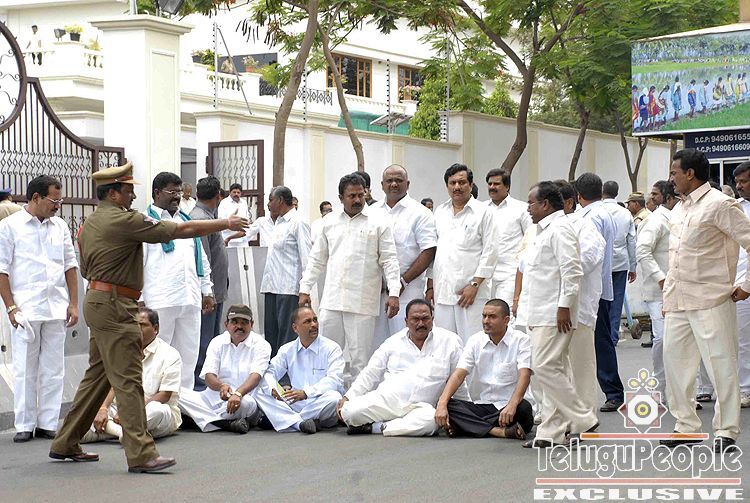 HYDERABAD: The police took into custody 61 MLAs, 10 MLCs and six MPs of the Telugu Desam Party when they staged a dharna in front of the camp office of Chief Minister Y.S. Rajasekhara Reddy on Sunday afternoon, demanding withdrawal of criminal proceedings against Kovvur MLA T.V. Rama Rao who was also among those arrested.