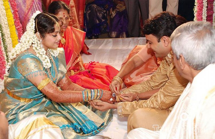 Amid tight personal security, popular heroine Meena , who made her debut as child artiste and was later promoted as heroine, got married with a Bangalore-based Software Engineer Vidyasagar at Arya Vysya Samaja Kalyanamandapam in Tirumala, abode of Lord Venkateswara Swamy.Meena wearing a sky blue Kanchivaram sari and diamond jewellery dazzled. After tying the nuptial knot, the newly-wed couple offered prayers to Lord Venkateswara and later left for Chennai, where reception is going to take place on July 14 (Tuesday) evening at Mayor Ramanathan Hall for Kollywood and Tollywood stars.During the marriage, reporters and electronic media were not allowed to get into the hall where marriage was taking place.In fact, they were attacked by her security personnel and two cameras were damaged.