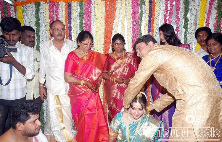 Amid tight personal security, popular heroine Meena , who made her debut as child artiste and was later promoted as heroine, got married with a Bangalore-based Software Engineer Vidyasagar at Arya Vysya Samaja Kalyanamandapam in Tirumala, abode of Lord Venkateswara Swamy.Meena wearing a sky blue Kanchivaram sari and diamond jewellery dazzled. After tying the nuptial knot, the newly-wed couple offered prayers to Lord Venkateswara and later left for Chennai, where reception is going to take place on July 14 (Tuesday) evening at Mayor Ramanathan Hall for Kollywood and Tollywood stars.During the marriage, reporters and electronic media were not allowed to get into the hall where marriage was taking place.In fact, they were attacked by her security personnel and two cameras were damaged.