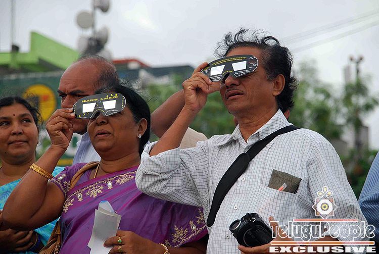 A partial solar eclipse is seen through clouds in Hyderabad