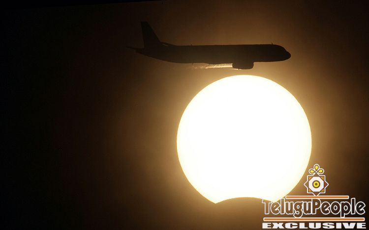 An aircraft flies past the sun during a solar eclipse above New Delhi, India on July 22, 2009.