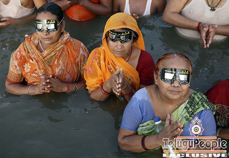 Hindu devotees observe a solar eclipse through specially-designed viewing glasses as they take holy dips in the Sangam, the confluence of the Ganges, Yamuna and the mythical Sarawati River, in Allahabad, India, Wednesday, July 22, 2009.