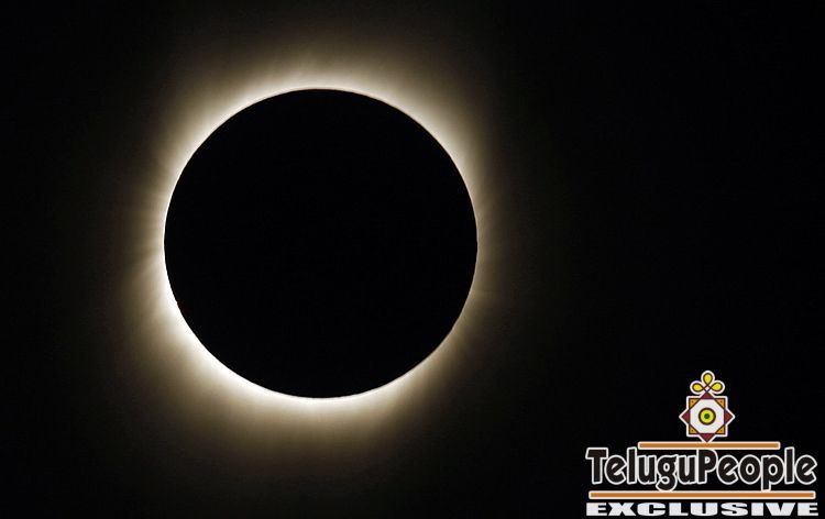 Much of the sun's corona becomes visible as the moon passes between the sun and the earth during a total solar eclipse, seen above Varanasi, India, Wednesday, July 22, 2009.