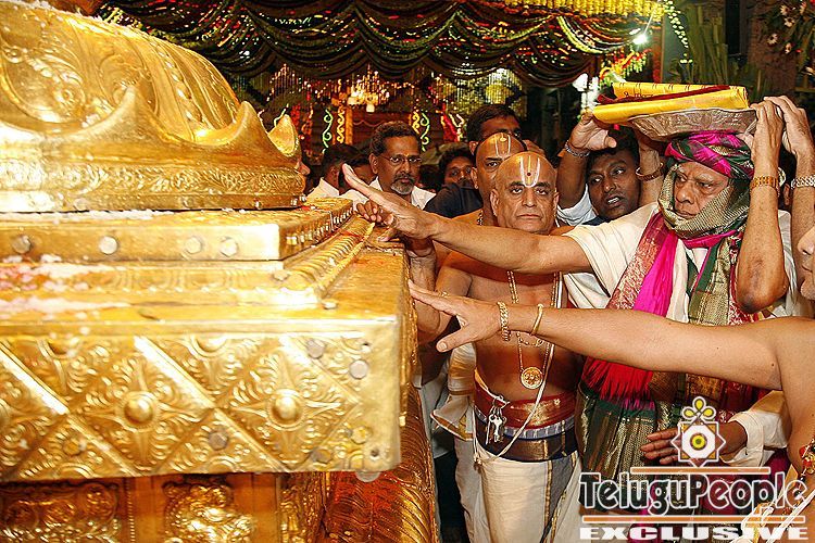 The Chief Minister carried the silver plate containing the `vastrams' on his head from the Bedi Anjaneya Swamy temple to the Venkateswara temple, accompanied by temple paraphernalia and `nadaswaram' music.Later he presented the `vastrams' to the chief priest, inside the sanctum sanctorum and TTD Chairman presented Sri Vari Prasadam at Ranganayakula Mandapam.