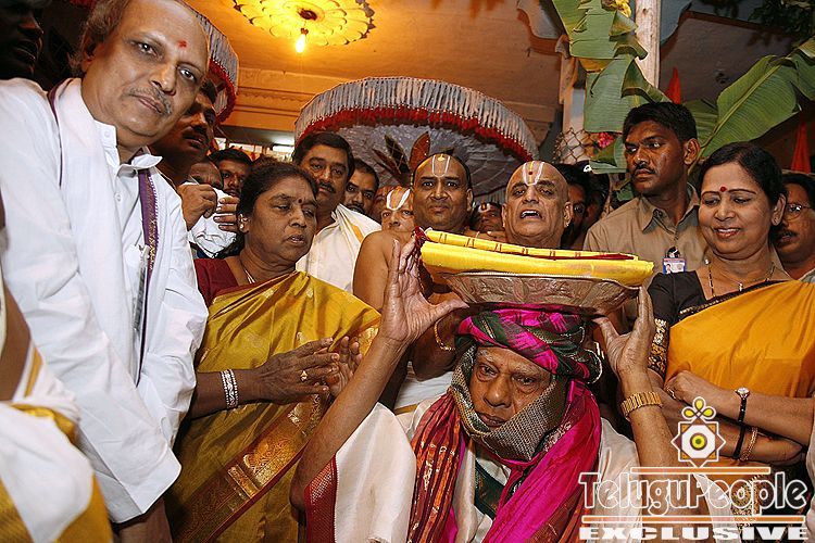 The Chief Minister carried the silver plate containing the `vastrams' on his head from the Bedi Anjaneya Swamy temple to the Venkateswara temple, accompanied by temple paraphernalia and `nadaswaram' music.Later he presented the `vastrams' to the chief priest, inside the sanctum sanctorum and TTD Chairman presented Sri Vari Prasadam at Ranganayakula Mandapam.