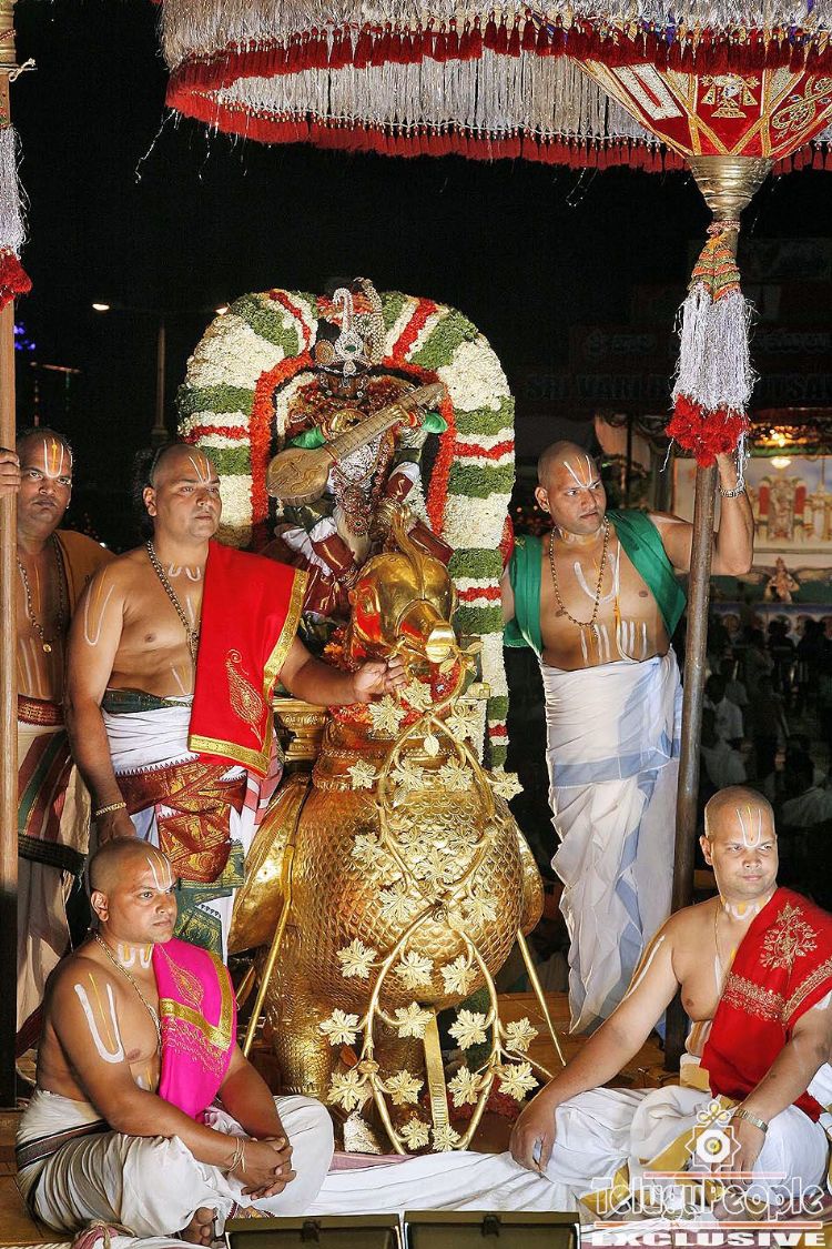 During the Srivari Brahmotsavam Lord Venkateswara sat proudly along with his consorts sat in a vahanam decked up milk white pearls in the shape of a pandal.