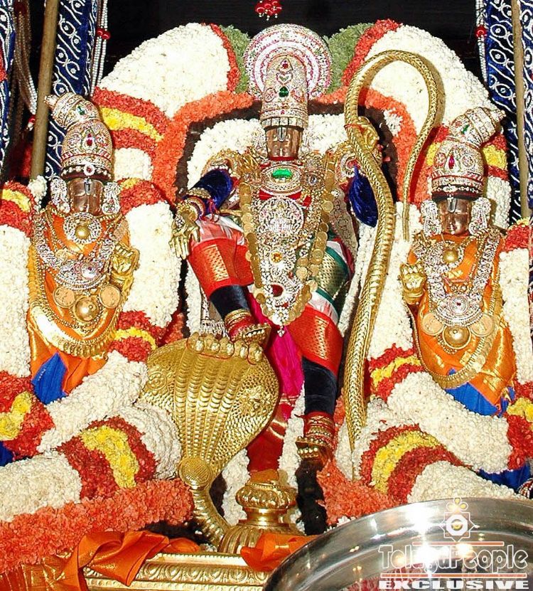 Lord Venkateswara appears before his devotees on the third day of the Srivari Brahmotsavam on a vehicle decorated with prices less and resplendent white pearls which denoted peace and patience .Legend says that pearls , a produce of sea, is formed when the dew and rain drops into pearl chip in the ocean . Even Sri Krishna wore pearl nose rings and necklaces and Lord Venkateswara hailed as “ Alankara priyudu”