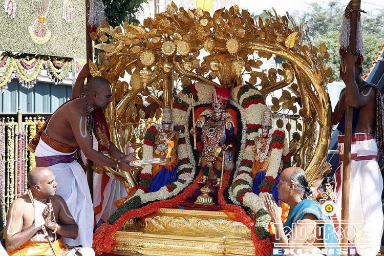 He rides on the Kalpa Vruksha vahanam and goes around the four mada streets around the temple giving darshan to thousands of people who come for witnessing the Srivari Brahmotsavam.