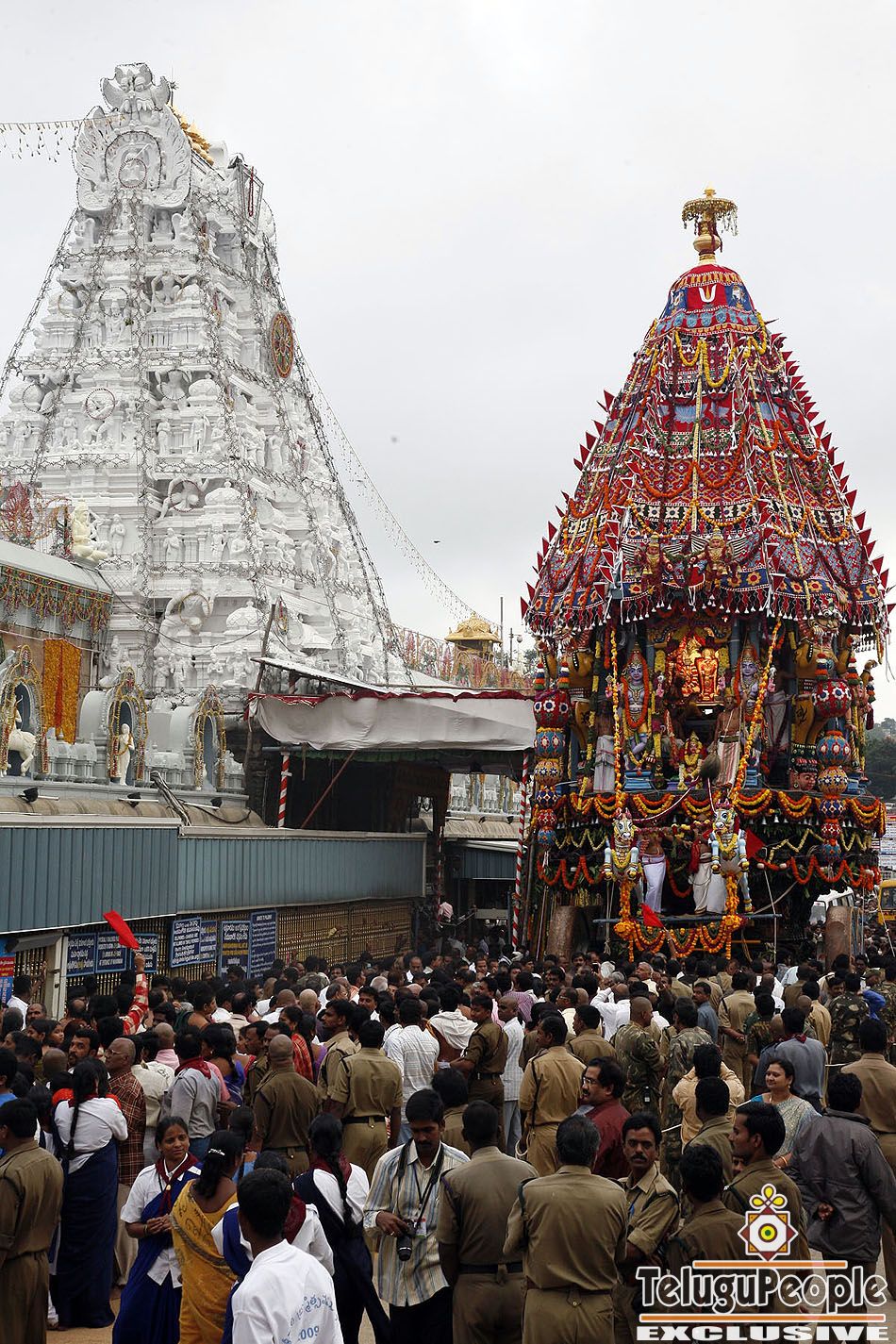 On the penultimate day of Srivari Brahmotsavam , on the eigth day, the Malayalappaswami is seated on a high pedestal throne and taken ina procession around the four mada streets around Tirumala for the benefit of devotees who throng the temple town for a glimpse of Lord Venkateswara in various vahanams and in forms .The Rathotsavam festival is a highly emotional event known for the flow of bhakti sangeet , keertans , bhajans and full pitched rendering by the devotees who accompany the procession of the deity .