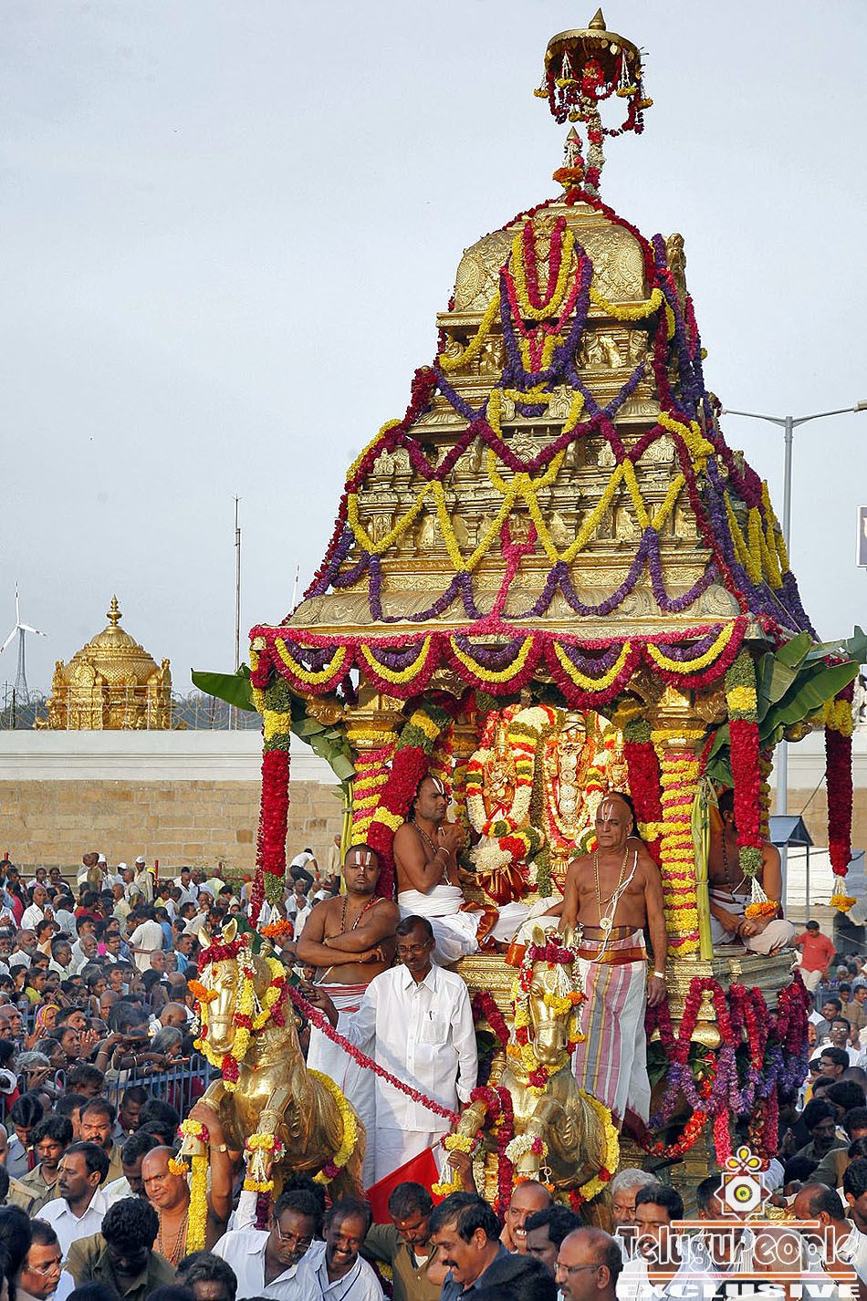 The sixth day of Srivari Brahmotsavam at Tirumala heralds a distinct and unique celebration popularly known Swarna Rathotsavam (the festival of the Golden chariot).Legends say that the golden chariot is considered to be faourite vehicle of Lord Venkateswara. Malayalappa gives darshan to his scores of devotees in grand style as his vehicle is preceeded by Shunya ratham of Brahma and other chariots dragged by Elephant , Ashwa and Vrushaba.