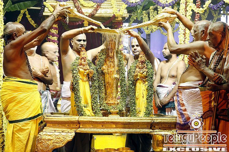 Temple Priests Sri Vari Temple performing Snapana Tirumanjanam (Celestial Bath) to Processional deities of Lord Malayappaswamy and His consorts in Connection with Sri Vari Annual Pushpa Yagam at sampangi prakaram inside Sri Vari Temple, Tirumala on Monday morning.& Procession of Sacred Flowers from Garden offfice to Sri Vari Temple, Tirumala in connection with Annual Sri Vari Pushpa Yagam on Monday. These flowers will be used for Pushpa Yagam.