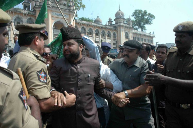 Police arrest pro-Telangana activists when they attempt to take out a rally as part of the Million March call given by the Telangana Political Joint Action Committee, near the historic Charminar in Hyderabad on Thursday. INN Photos