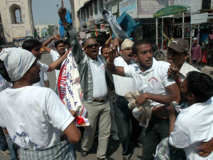 Police arrest pro-Telangana activists when they attempt to take out a rally as part of the Million March call given by the Telangana Political Joint Action Committee, near the historic Charminar in Hyderabad on Thursday. INN Photos