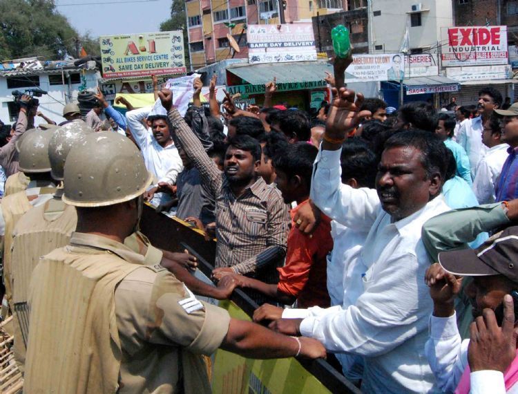 In a major show of strength, thousands of people violated ban orders and removed police barricades to assemble at Tank Bund area here on Thursday as part of the 'million march' for a separate Telangana state. The peaceful protest during the day was marred by incidents of violence in the evening. Protesters damaged some statues of Telugu leaders on Tank Bund, set afire a police vehicle and attacked a vehicle and crew of a television channel. -INN Photos