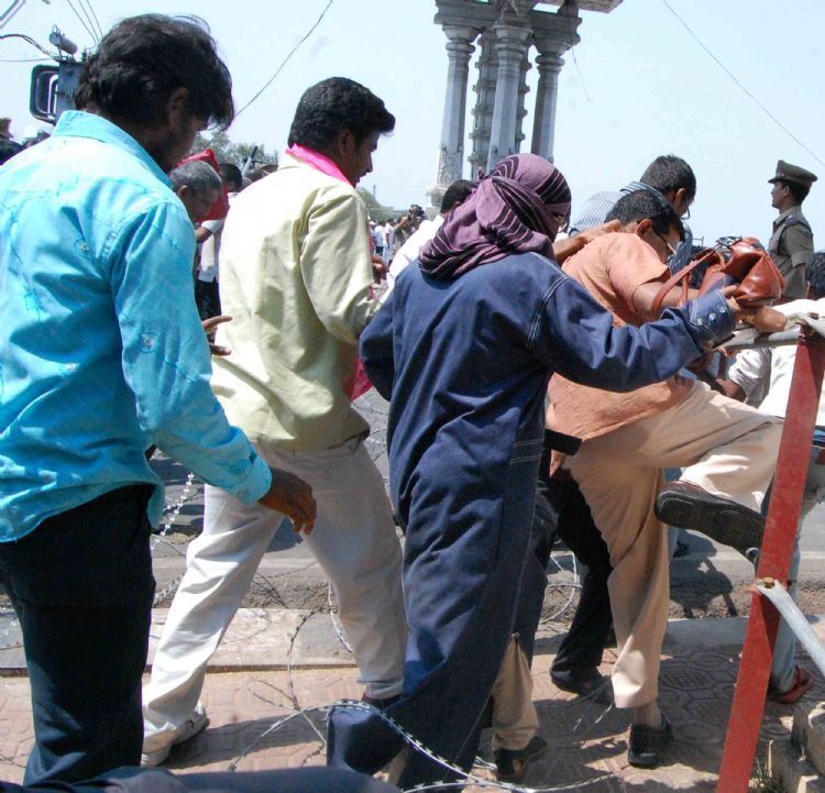 In a major show of strength, thousands of people violated ban orders and removed police barricades to assemble at Tank Bund area here on Thursday as part of the 'million march' for a separate Telangana state. The peaceful protest during the day was marred by incidents of violence in the evening. Protesters damaged some statues of Telugu leaders on Tank Bund, set afire a police vehicle and attacked a vehicle and crew of a television channel. -INN Photos