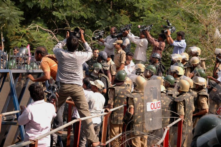 In a major show of strength, thousands of people violated ban orders and removed police barricades to assemble at Tank Bund area here on Thursday as part of the 'million march' for a separate Telangana state. The peaceful protest during the day was marred by incidents of violence in the evening. Protesters damaged some statues of Telugu leaders on Tank Bund, set afire a police vehicle and attacked a vehicle and crew of a television channel. -INN Photos