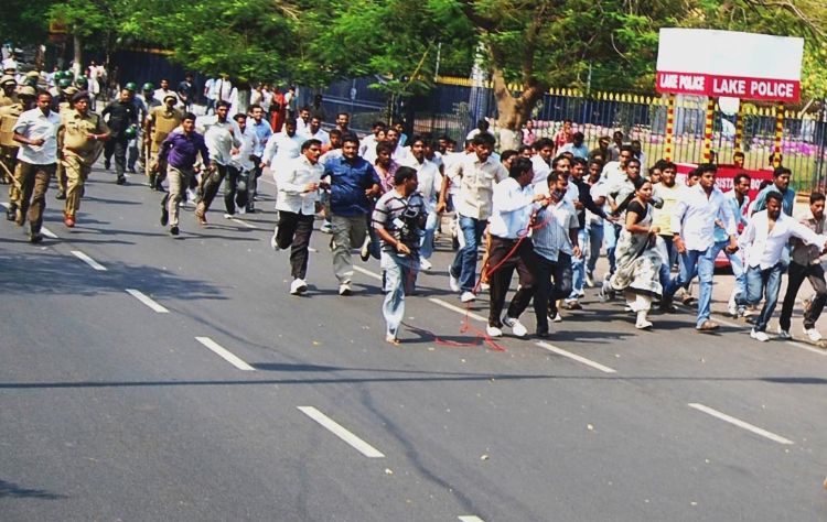 In a major show of strength, thousands of people violated ban orders and removed police barricades to assemble at Tank Bund area here on Thursday as part of the 'million march' for a separate Telangana state. The peaceful protest during the day was marred by incidents of violence in the evening. Protesters damaged some statues of Telugu leaders on Tank Bund, set afire a police vehicle and attacked a vehicle and crew of a television channel. -INN Photos