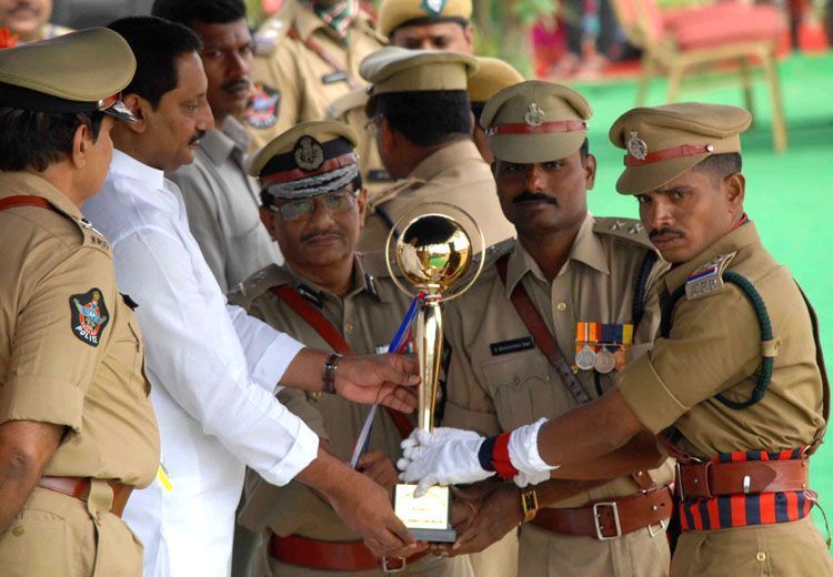 Chief Minister N.Kiran Kumar Reddy presenting trophy to outstanding police officers on the occasion of AP Formation Day at the NTR Stadium here on Tuesday.
