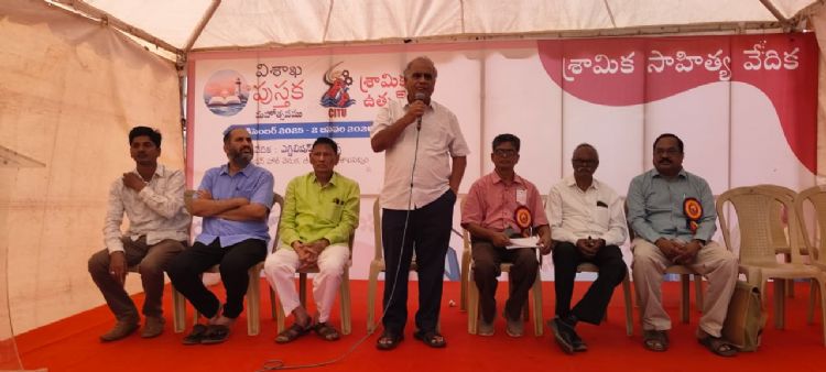 Writer Telakapalli Ravi speaking at book exhibition at Shramik Utsav in Visakhapatnam on Sunday.