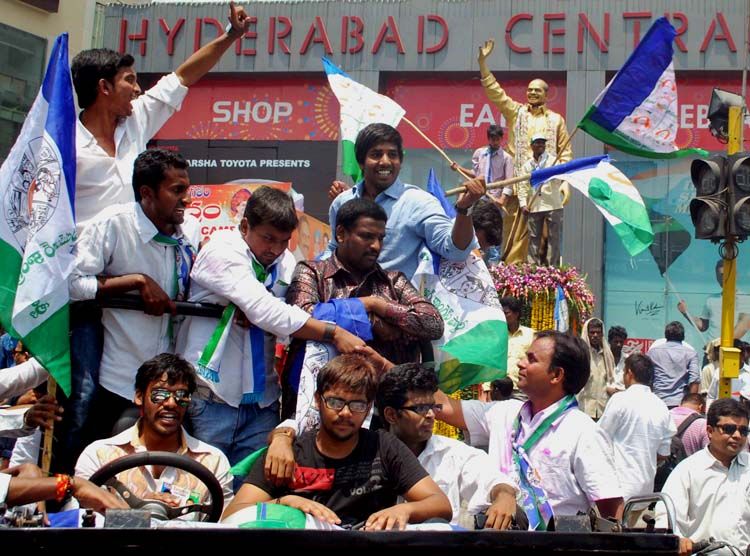 YSR Congress Party supporters in Hyderabad burst firecrackers after party candidates YS Jaganmohan Reddy and YS Vijaylakshmi were declared victors in the by-elections to Kadapa Lok Sabha and Pulivendula Assembly constituencies on Friday. INN Photos