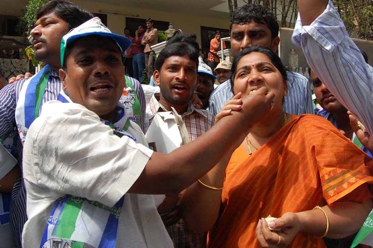 YSR Congress Party supporters in Hyderabad burst firecrackers after party candidates YS Jaganmohan Reddy and YS Vijaylakshmi were declared victors in the by-elections to Kadapa Lok Sabha and Pulivendula Assembly constituencies on Friday. INN Photos