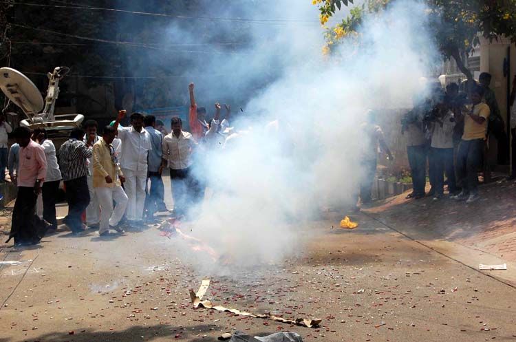 YSR Congress Party supporters in Hyderabad burst firecrackers after party candidates YS Jaganmohan Reddy and YS Vijaylakshmi were declared victors in the by-elections to Kadapa Lok Sabha and Pulivendula Assembly constituencies on Friday. INN Photos