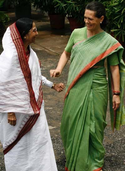 Warm Welcome: Congress president and UPA chairperson Sonia Gandhi welcomes UPA candidate for presidential polls Pratibha Patil
