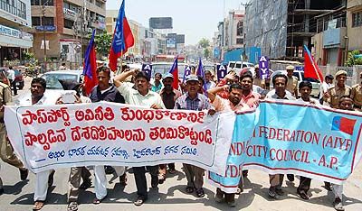 Punish Fake Passport Scamsters: Activists of All India Youth Federation took out a rally at Liberty cross roads in Hyderabad on tuesday demanding stringent action against who involved in fake passports scam.