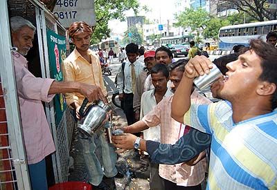 Quench the thirst: Due to hot and humid weather people throng roadside water camps setup by charities to quench their thirst in Hyderabd.