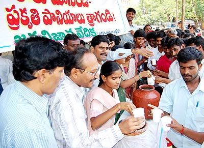 Love Nature: Activists of Jana Vignana Vedika offers free butter milk to public to avoid coke and other areted drinks at Baghlingampally on wednesday in Hyderabad.