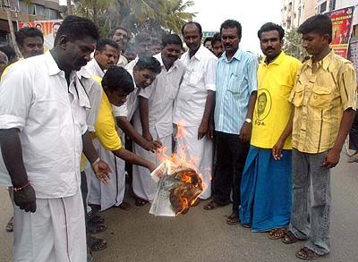 Son provoked: Supporters of M K Azhagiri, elder son of Chief Minister M Karunanidhi, burning copies of