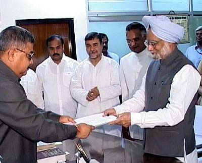 Seeking back door entry: Prime Minister Manmohan Singh submiting his nomination paper for Rajya Sabha seat from Assam at Assam Legislative Assembly Secretariat, Dispur on Wednesday.
