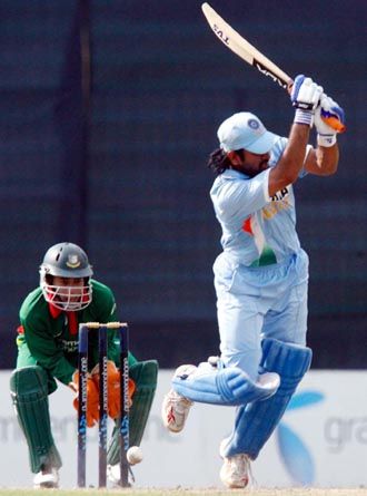 Blistering knock: India s Mahendra Dhoni (R) hits a ball as Bangladesh wicket keeper Mushfiqur Rahim watches during their first one-day international cricket match in Dhaka May 10, 2007.